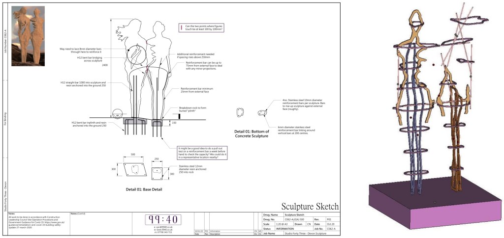 Amanda Cotton approached Thom Bridle of Studio 43 to develop the design and construct it (Studio 43 are a company that builds complicated large scale 3D art works). Studio 43 approached us to carry out the structural engineering design. We would need to make sure the sculpture could withstand the corrosive elements of the sea, and resist the considerable force of coastal storms. The sculpture would be made of concrete, so designing it as reinforced concrete, with embedded steel bars, would be within the normal scope of structural engineering.